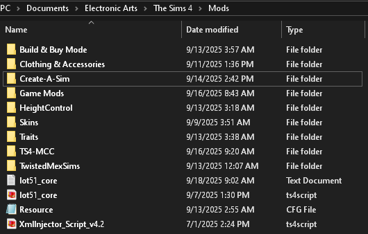 There are three parts to this answer… 1) I cannot list all my custom content and mods as I have over 4,000 files! 2) However, I can tell you I use Deaderpool’s MC Command Center for the brains of all my operations. I am also using Better Build Buy & ModGuard from TwistedMexi. Inside the Game Mods directory there is lot of adeepindigo, LittleMsSam, Scumbumbo [RIP], SimRealist, and Pancake & Mizore mods. My height mods which come in hand when doing the tween stages is from MycroftJr. As for the skins: this comes from ThisIsThem. Lot of the build/buy, clothing, and CAS material comes from many on The Sims Resource which I have been a member over two decades, my three favorite authors are McLayneSims, Beto, and PlumbobsNFries,(for the clothing) and for hair: CasualSims, SClub, and SonyaSims. Finally 3) Take a close look at this screenshot, this is best way to keep your custom content and mods organized. I keep the mod engine requirements like XML and Lot 51 Core outside but everything else is one folder deep. No other folders lie inside that-ever! I always know TS4-MCC, TwistedMexSims & Game Mods are the ones I pull first after an update after checking the engine files.